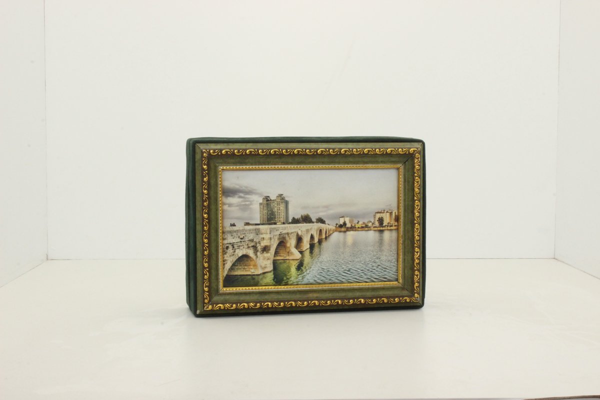 Haki Yeşili Kadife Kaplanmış Çerçeveli Taşköprü Baskılı Mukavva
